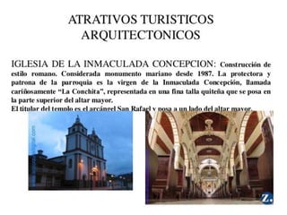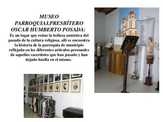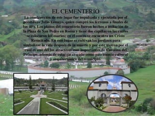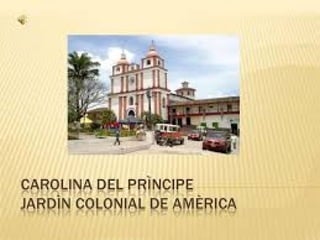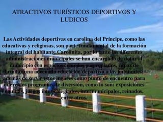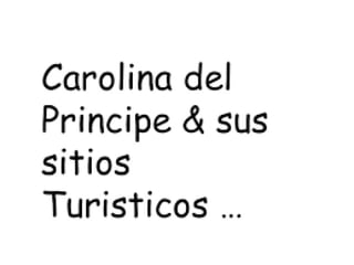 Este documento menciona algunos lugares de interés en el municipio de Carolina del Príncipe en República Dominicana, incluyendo la iglesia, cavernas, La Vega, la cascada y represa Miraflores, una estatua y las fiestas del municipio. El documento también indica que a través de fotografías breves se ha presentado una visión general del municipio.