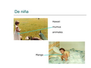 #3 Cuando yo era niña, yo vivía en Hawaii. Tenía más o menos 6 años. Llevaba vestidos muy largos. Se llamaban “mumus”. Me gustaban los animales mucho. Tenía un gato que se llamaba “Mango”. En esta foto, yo dormía con Mango. A Mango no le gustaba mucho dormir conmigo.
