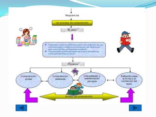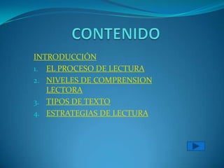 Este documento describe la importancia de la lectura y los diferentes niveles y estrategias de comprensión lectora. La lectura es fundamental para el aprendizaje, desarrollo de la inteligencia y adquisición de cultura. La escuela debe promover el hábito de lectura de poemas, cuentos y novelas para estimular la interpretación de textos en los estudiantes. Además, la lectura potencia la formación estética y educa la sensibilidad.