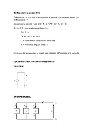 El documento describe la generación de corriente eléctrica a través de dinamos y transformadores, así como los conceptos de reactancia inductiva, reactancia capacitiva, circuitos RCL, impedancia, potencia y resonancia en circuitos de corriente alterna. Específicamente, explica cómo las dinamos generan corriente eléctrica a partir de energía mecánica y cómo los transformadores aumentan o disminuyen la tensión eléctrica manteniendo la potencia a través de la inducción electromagnética.
