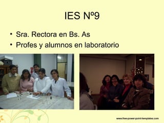 El documento celebra el Día del Profesor 2010 y muestra fotos de profesores y alumnos en el laboratorio de la Escuela Secundaria No. 9. También describe cursos y capacitaciones de profesores en temas como TICs, física, química y ciencias, así como maestrías realizadas por profesores en Córdoba y Buenos Aires.
