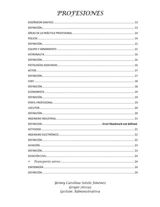 Este documento presenta definiciones y descripciones breves de varias profesiones como juez, médico, profesor, ingeniero de sistemas, veterinario, contador público, ingeniero civil, diseñador gráfico, policía, astronauta, actor, chef, economista, locutor, ingeniero industrial, ingeniero electrónico, aviador, enfermero, especialista en mercadotecnia y publicidad y psicólogo. Para cada profesión, se proporciona una definición, áreas de especialización y responsabilidades asociadas de manera conc
