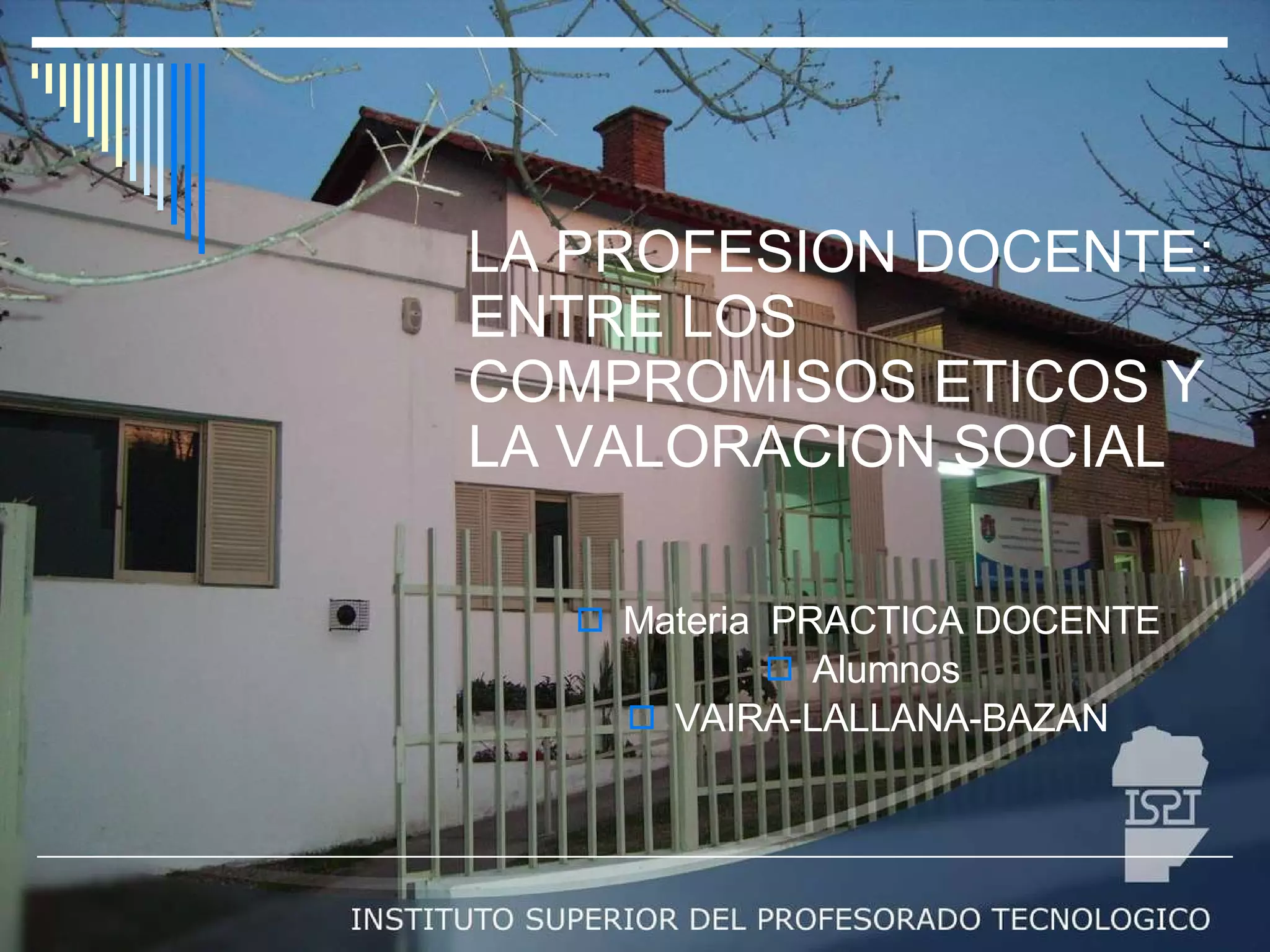 El documento discute la profesión docente y la tensión entre los compromisos éticos de los maestros y su valoración social. Argumenta que la sociedad valora a los maestros según los mismos parámetros que ellos promueven en la educación y que los intereses éticos de la sociedad no siempre coinciden con las prácticas educativas de los maestros. También examina conceptos como profesión docente, profesionalidad del maestro y el contexto social en que desempeñan su labor.