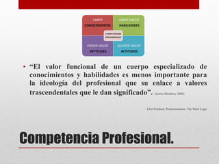 El documento trata sobre el tema de la competencia profesional en salud. Define la competencia profesional como la capacidad de un profesional para utilizar sus conocimientos, habilidades y buen juicio en todas las situaciones que pueden enfrentar en el ejercicio de su práctica. Discute conceptos como el profesionalismo, la honestidad, la confidencialidad, la calidad de la atención y el acceso a la atención. Resalta la importancia del conocimiento científico y la experiencia clínica para el desarrollo de competencias prof