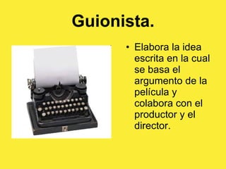 El documento describe las diferentes profesiones del cine, incluyendo guionistas, productores, directores, directores de fotografía, operadores de cámara, iluminadores, directores artísticos, figurinistas, peluqueros, maquilladores, actores, especialistas, figurantes y montadores, todos los cuales desempeñan roles importantes en la creación de una película.