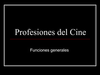 El documento describe las principales profesiones del cine y sus funciones generales. Estas incluyen guionistas, productores, directores de fotografía, operadores de cámara, técnicos de sonido, directores, directores artísticos, montadores, actores protagonistas, actores secundarios y figurantes. Cada profesión juega un papel específico en la producción, dirección, fotografía, sonido, arte o actuación de una película.