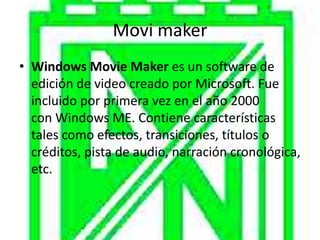 Windows Movie Maker es un software de edición de video que permite crear películas usando fotografías y agregar efectos, transiciones, audio y narración. Puede usarse para editar videos caseros o crear presentaciones con fotos narradas que pueden compartirse en línea o reproducirse en otros dispositivos. Sus funciones principales son editar videos, agregar efectos y crear presentaciones con fotos y audio para compartir digitalmente.