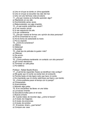 Este documento presenta un test de estilos de aprendizaje de 33 preguntas para identificar el sistema de representación predominante de una persona - visual, auditivo o kinestésico. Explica brevemente cada sistema, señalando que los estudiantes visuales aprenden mejor leyendo o viendo información, los auditivos al escuchar explicaciones, y los kinestésicos asociando información a sensaciones y movimientos. El documento instruye al lector a marcar sus respuestas y sumarlas para determinar su sistema de representación predominante.