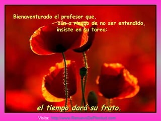Este documento enumera las bienaventuranzas del profesor, describiendo las actitudes y cualidades positivas de un buen maestro como insistir en su labor a pesar de las dificultades, confiar en Dios y en las capacidades de los estudiantes, promover valores así como actualizarse continuamente y comprometerse plenamente con su vocación.