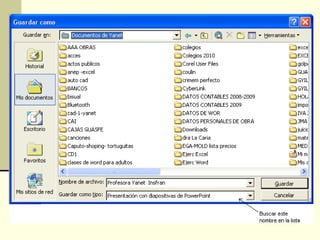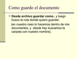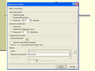 El documento explica cómo guardar y completar una presentación de PowerPoint, incluyendo cómo insertar música. Detalla los pasos para guardar el documento en la ubicación deseada, guardarlo una vez terminado como una presentación de PowerPoint, e insertar música programando su reproducción y detención en una diapositiva específica.