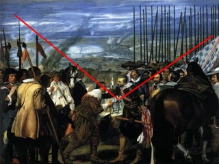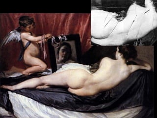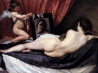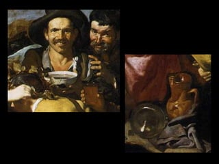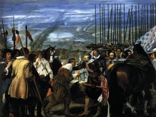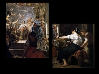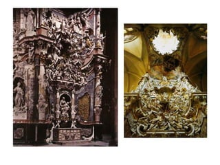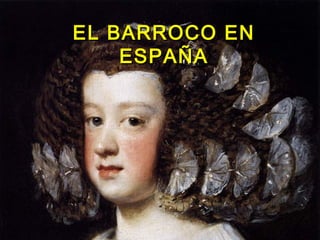 El documento resume las características principales del Barroco en España. Explica que hubo tres periodos: Primer Barroco, Barroco Pleno y Rococó. Describe la arquitectura, escultura e imaginería de cada época, haciendo hincapié en la influencia de la Iglesia Católica. También analiza las principales características y obras maestras de la pintura española del Siglo de Oro, con artistas como Velázquez, Zurbarán y Murillo.