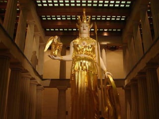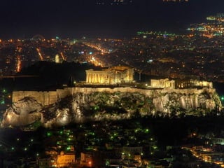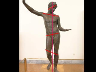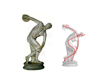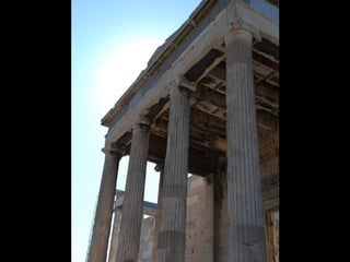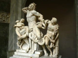 El documento presenta información sobre el arte griego antiguo. Explica el arte minoico, caracterizado por los palacios como el de Cnossos y la pintura; el arte micénico, con ciudadelas como Micenas y su arquitectura megarónica; y el arte griego clásico, con su arquitectura de templos como el Partenón y su escultura de figuras como el Discóbolo.