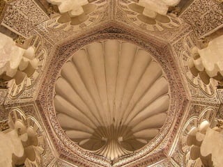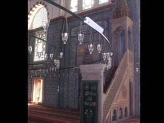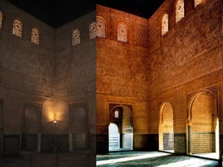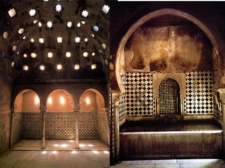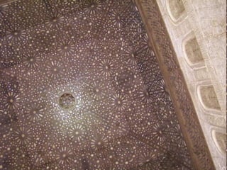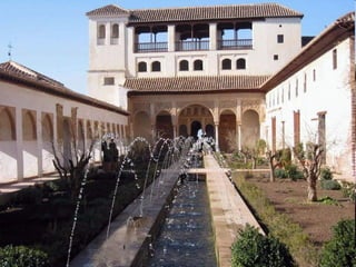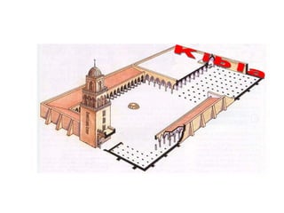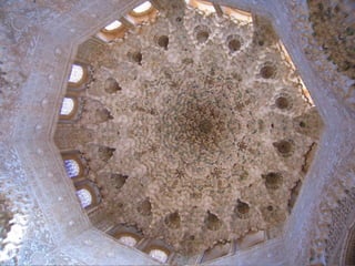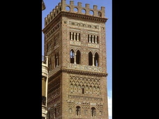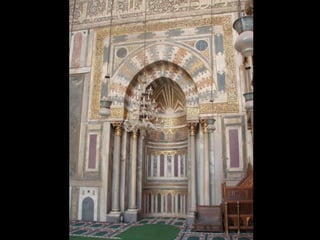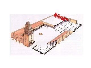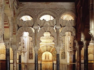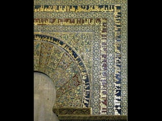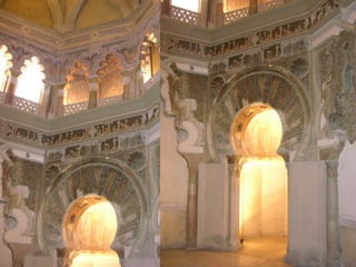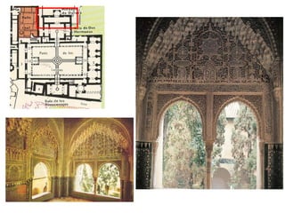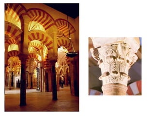 Este documento presenta un esquema de clase sobre el arte hispanomusulmán. Explica la evolución histórica del arte musulmán, las características de las mezquitas y su tipología. Luego se enfoca en el arte hispanomusulmán, describiendo importantes edificios como la Mezquita de Córdoba y la Alhambra de Granada. Finalmente, introduce el arte mudéjar y sus principales características.