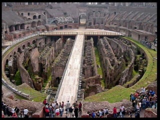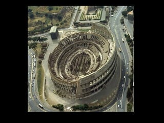 El documento describe el arte romano, incluyendo su arquitectura, escultura y pintura. Explica el precedente etrusco, analiza los diferentes tipos de edificios romanos como templos, teatros, anfiteatros y termas, y describe obras maestras como el Panteón, el Coliseo y los arcos de triunfo. También cubre la urbanización romana, con su uso del sistema de cardo y decumano, y analiza el desarrollo del arte a lo largo de la historia romana desde la República hasta el Imperio