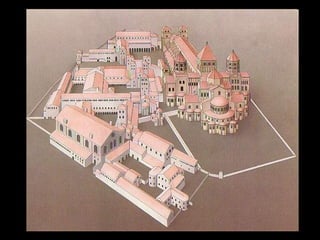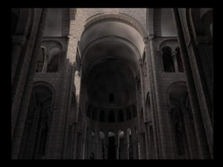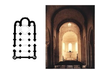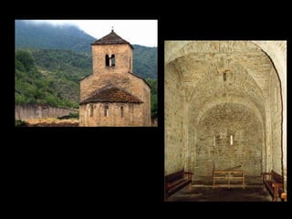 Este documento presenta información sobre la arquitectura, pintura y escultura románicas en España y Europa. Explica las características de estos estilos artísticos como las plantas de iglesias, el uso de bóvedas y arcos, y los temas y técnicas pictóricas. También describe importantes ejemplos arquitectónicos como las catedrales de Santiago de Compostela, Jaca y Pisa, y obras pictóricas como el Pantocrátor de San Clemente de Tahüll.