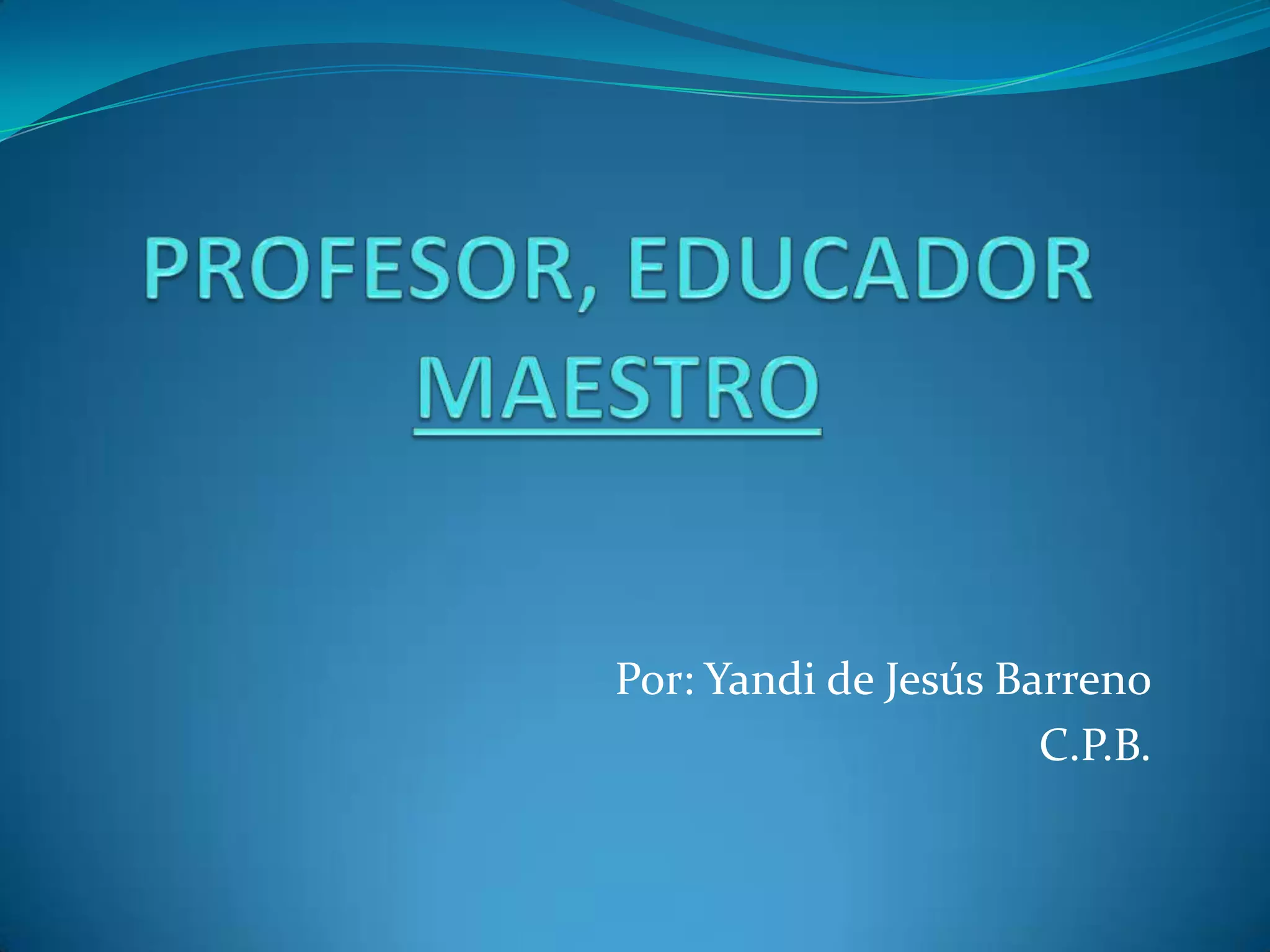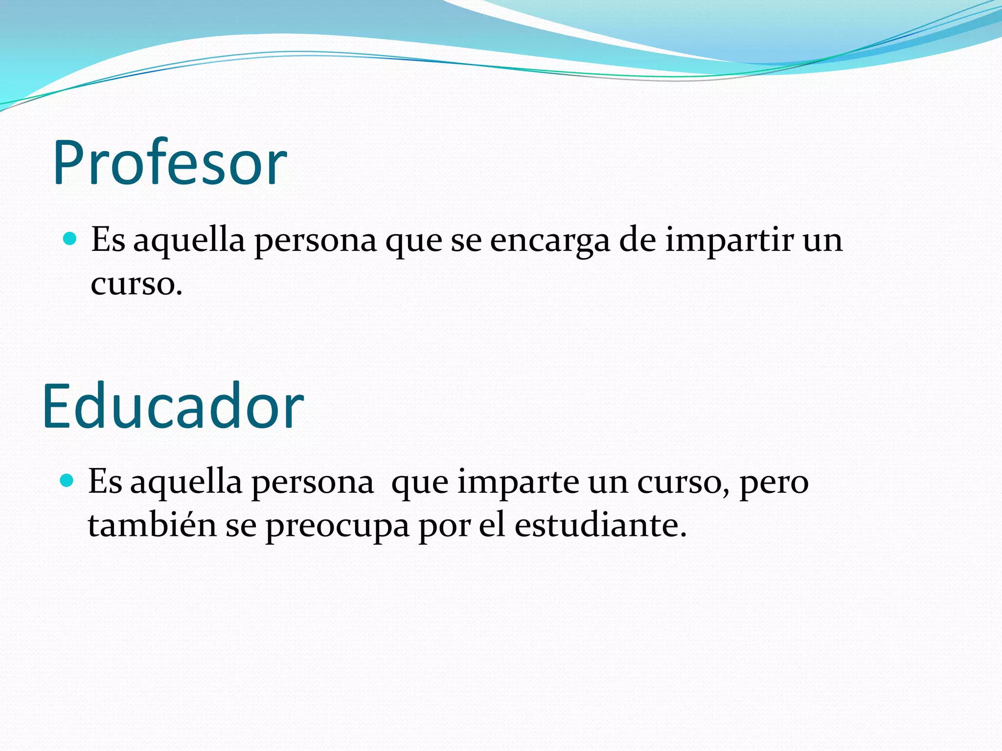 El documento define y compara los términos "profesor", "educador" y "maestro". Un profesor se encarga de impartir un curso, mientras que un educador también se preocupa por el estudiante. Un maestro no solo enseña el curso, sino que también se preocupa por sus alumnos, los aconseja y siempre está dispuesto a ayudarlos, sirviendo como el mejor ejemplo de apoyo a los estudiantes en su aprendizaje y desarrollo personal.