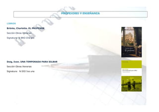 El documento lista varias obras literarias y películas relacionadas con profesores y la enseñanza, así como libros sobre educación. Cada entrada incluye el título, autor o director, sección y signatura.