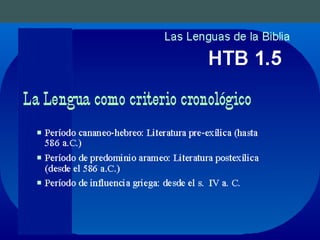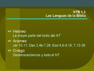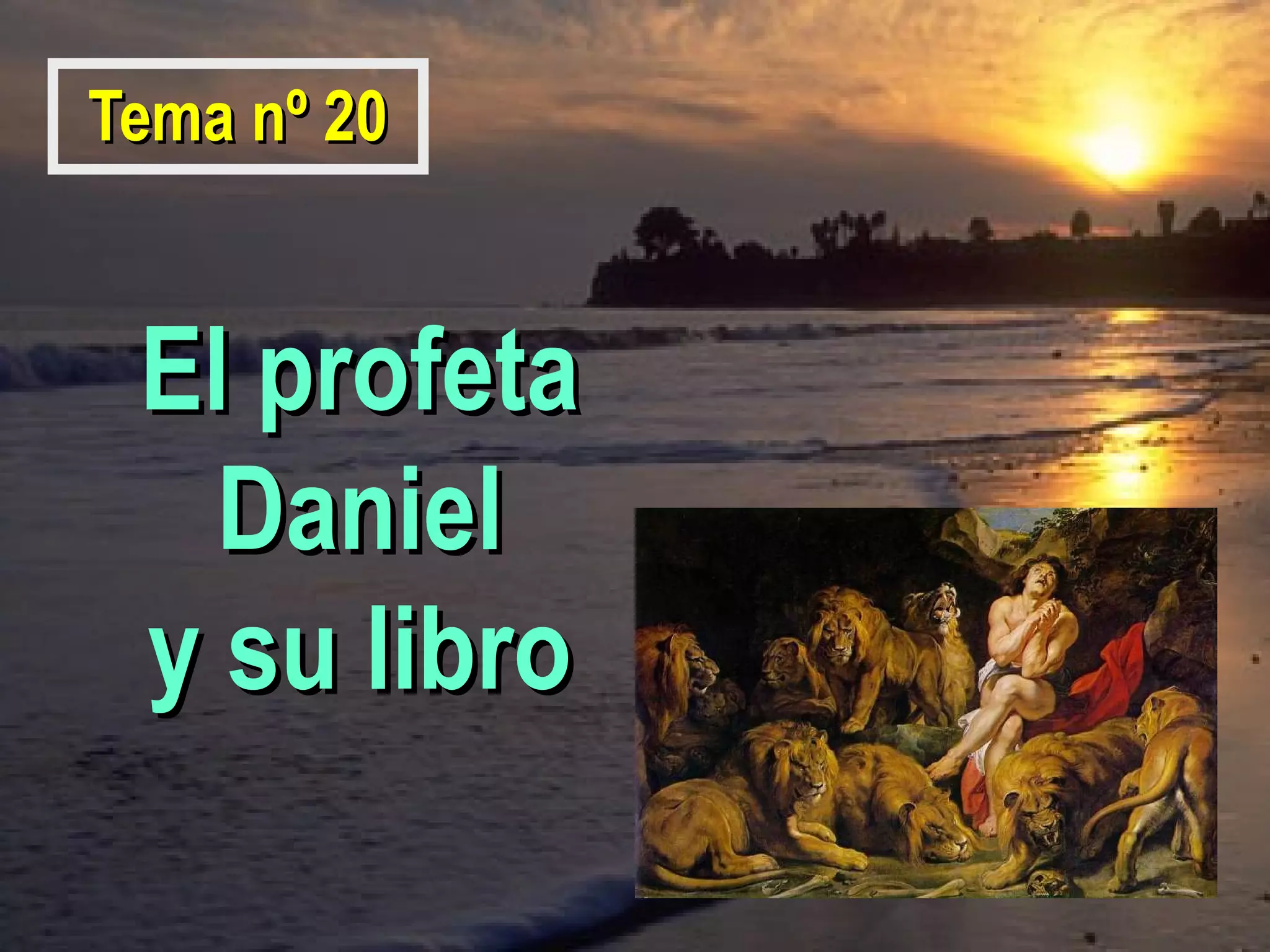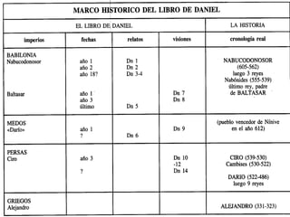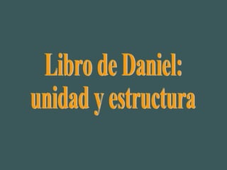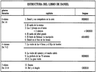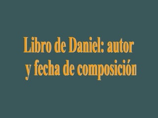 El documento habla sobre el libro de Daniel y su autor. Explica que Daniel vivió durante el exilio judío en Babilonia y el posterior imperio persa. Discute las diferentes teorías sobre la fecha de composición del libro, que varían entre el siglo VI a.C. hasta el II a.C. Finalmente, analiza las lenguas utilizadas en el libro, el hebreo y el arameo, y cómo esto puede ayudar a datar diferentes secciones.