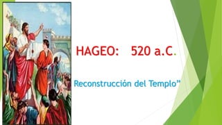 1) Hageo alentó a los judíos a reconstruir el templo de Jerusalén, advirtiéndoles que Dios les ordenaba terminar la obra y prometiendo que la gloria del nuevo templo sería mayor que la del anterior.