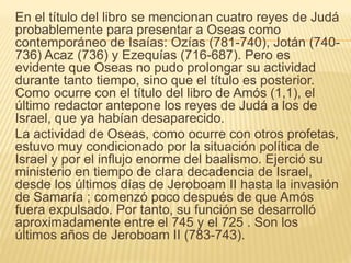 El documento presenta información sobre el profeta Oseas. Brevemente, Oseas ejerció su ministerio profético en Israel entre los años 745-725 d.C., durante el declive del reino de Israel. Utilizó imágenes como la de la esposa infiel para denunciar la idolatría del pueblo y anunciar el castigo divino. Además, introdujo la noción bíblica de la alianza entre Dios y su pueblo basada en el amor conyugal.