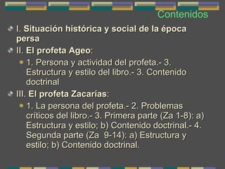 El documento describe la situación histórica y social de la época persa, así como las actividades de los profetas Ageo y Zacarías relacionadas con la reconstrucción del Templo en Jerusalén después del exilio babilónico. Habla sobre la persona y el ministerio de cada profeta, la estructura y contenido de sus libros, y cómo promovieron la esperanza mesiánica y la renovación espiritual entre el pueblo judío.