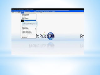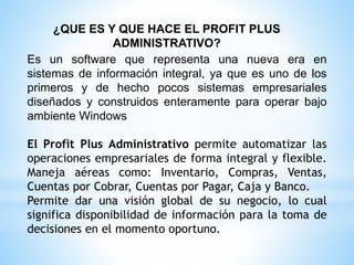 El documento describe el software Profit Plus Administrativo, un sistema integral diseñado para automatizar las operaciones empresariales de forma flexible. Permite manejar áreas como inventario, compras, ventas, cuentas por cobrar y pagar, caja y banco para tener una visión global del negocio. Explica los requisitos técnicos, la interfaz de usuario y las funciones principales del software.