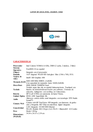 Este documento describe las características de una laptop HP 240 G5 con procesador Intel Celeron N3060, incluyendo una pantalla de 14 pulgadas, 4GB de RAM, disco duro de 500GB, teclado en español latinoamericano, cámara web HD 720p, conectividad inalámbrica Wi-Fi y Bluetooth, y una autonomía de batería de hasta 9 horas.