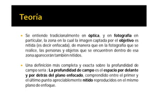 El documento describe la profundidad de campo en fotografía. Explica que la profundidad de campo depende del diafragma, la distancia focal y la distancia de enfoque. Cuanto más cerrado esté el diafragma, mayor será la profundidad de campo. Asimismo, cuanto más lejos esté el objeto y menor sea la distancia focal, mayor será la profundidad de campo. El documento también analiza cómo la profundidad de campo afecta diferentes géneros fotográficos y cómo puede usarse como herramienta creativa.