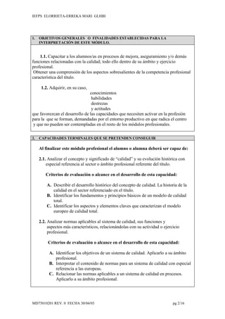 Este documento presenta la programación de un módulo de Calidad y Mejora Continua impartido en el IEFPS ELORRIETA-ERREKA MARI GLHBI durante el curso escolar 2010-2011. El módulo se imparte de forma transversal a todos los ciclos y tiene como objetivos capacitar a los estudiantes en procesos de mejora y calidad relacionados con su ámbito profesional. Se establecen tres capacidades terminales que los estudiantes deben adquirir, relacionadas con el concepto de calidad, normas aplicables y particip