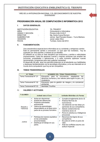 Este documento presenta la programación anual de computación e informática para el primer grado de la Institución Educativa "El Triunfo" en Tumbes, Perú. La programación contiene 4 unidades didácticas que se enfocan en introducir a los estudiantes al uso básico de computadoras y software como Windows, Word y PowerPoint, así como enseñarles a crear presentaciones y textos digitales.
