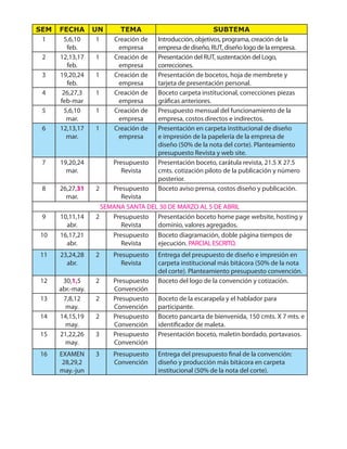 Este documento presenta la programación de la asignatura "Costos y Presupuestos" de la carrera de Tecnología en Comunicación Gráfica de la Universidad Minuto de Colombia. La asignatura busca que los estudiantes entiendan cómo funciona un negocio independiente, elaboren presupuestos adecuados para proyectos gráficos y aprendan a cobrar de manera correcta por sus servicios. La programación detalla 16 temas a tratar divididos en 3 unidades y presenta las fechas de entrega de trabajos y exámen