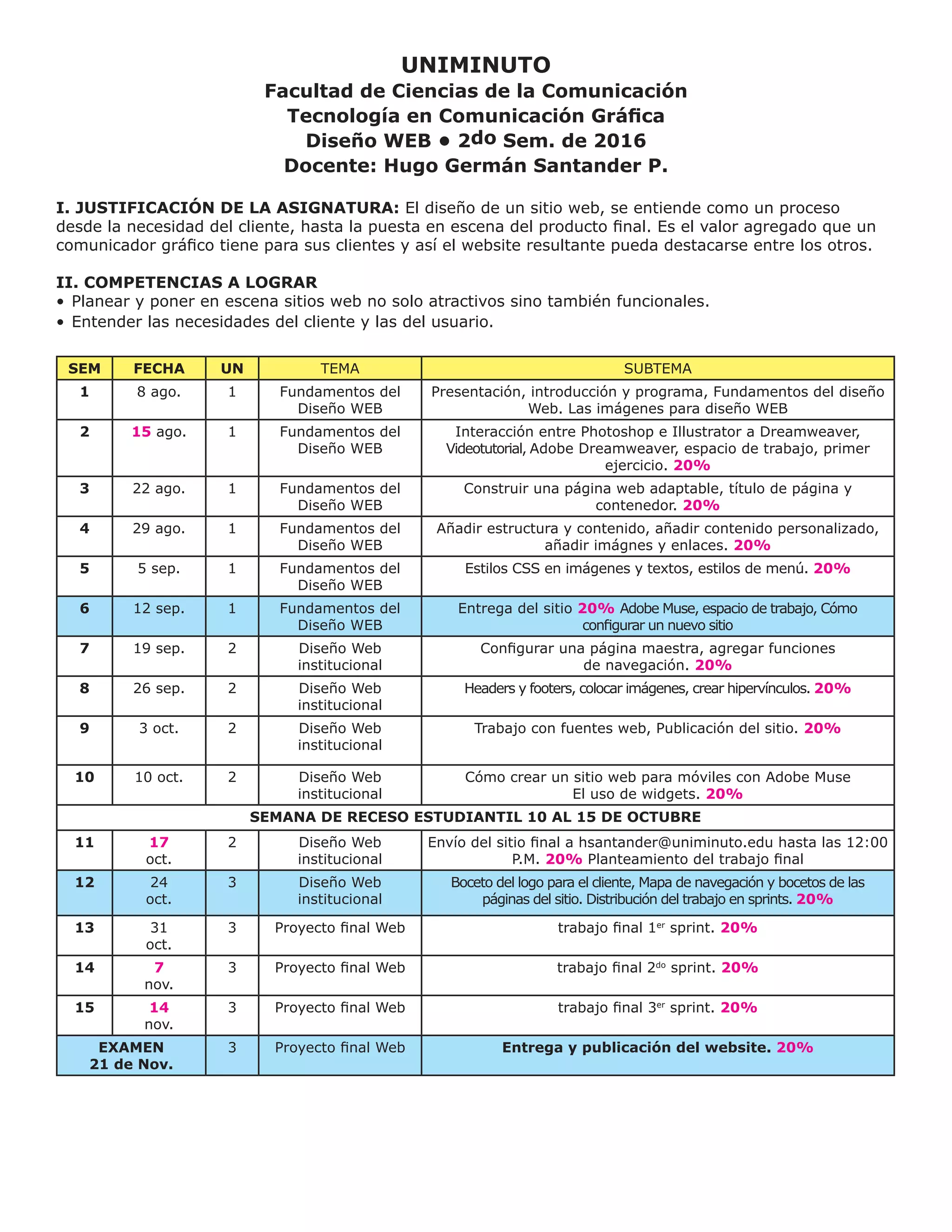 Este documento presenta el plan de estudios para la asignatura de Diseño Web del segundo semestre de 2016 en la Facultad de Ciencias de la Comunicación de la Universidad Minuto de Dios. La asignatura se enfoca en enseñar los fundamentos del diseño web, diseño web institucional y el desarrollo de un proyecto web final. Los estudiantes serán evaluados a través de tres parciales y un examen final.