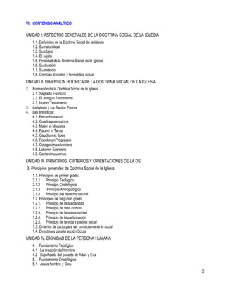 Este documento presenta el programa de la asignatura "Doctrina Social de la Iglesia" impartida en la Unidad Académica Campesina de Batallas. El objetivo es que los estudiantes comprendan las enseñanzas de la Iglesia Católica y se comprometan con la sociedad. El contenido incluye los aspectos generales, la dimensión histórica, los principios y la dignidad humana. La metodología implica investigación, análisis y visitas a comunidades para detectar problemas sociales.
