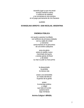 Este documento contiene varios poemas cortos en español de diferentes autores. El primer poema habla sobre una mujer que busca olvidar su tristeza jugando como una niña. El segundo poema describe a una "enemiga pública" que canta y bebe en la penumbra. El tercer poema reflexiona sobre la vida contemplativa en silencio y soledad.