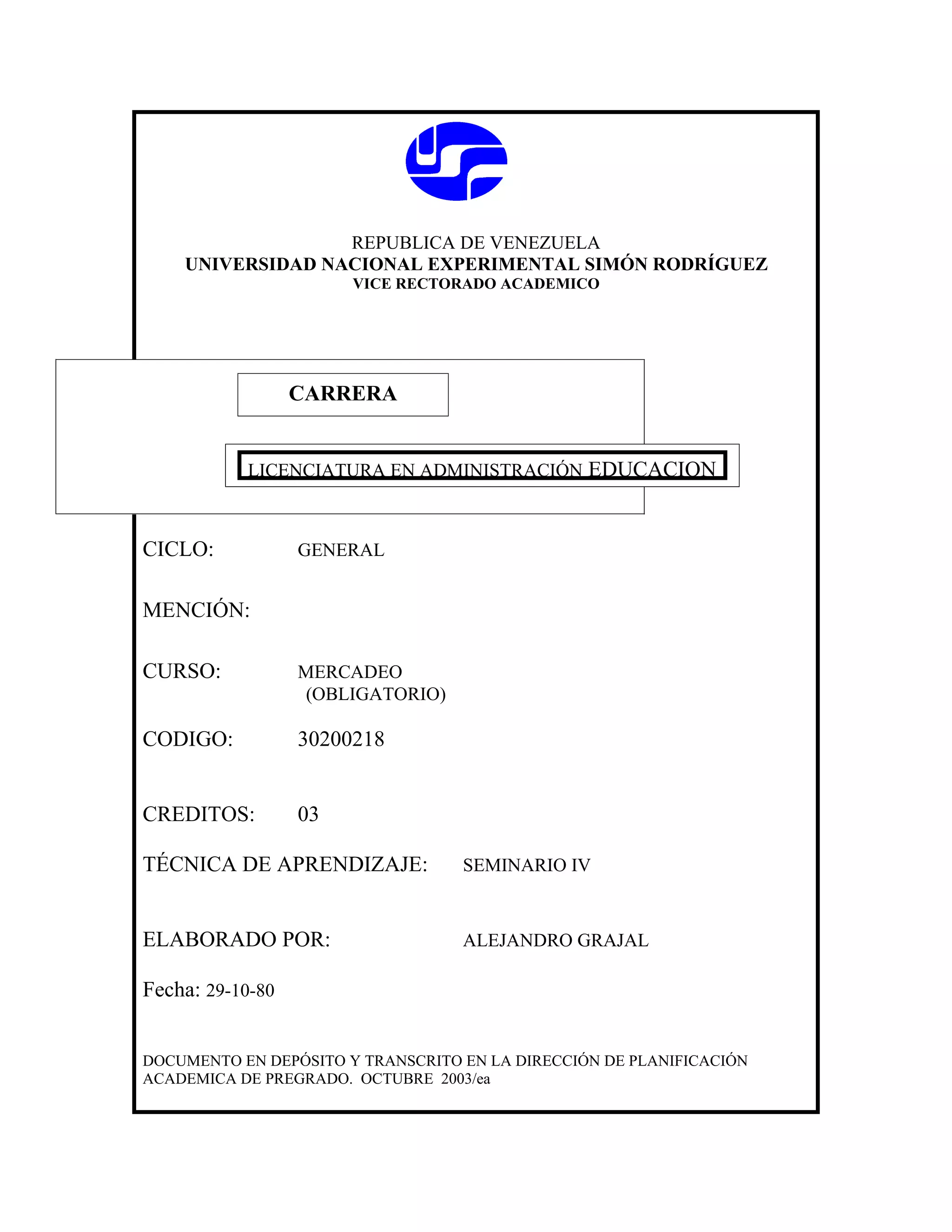 Este documento presenta el plan de estudios para la Licenciatura en Administración Educativa en la Universidad Nacional Experimental Simón Rodríguez. Incluye seis unidades curriculares sobre conceptos básicos de mercadeo, segmentación de mercados, fundamentos económicos, sociología, psicología y análisis gerencial del mercadeo. Cada unidad tiene objetivos y contenidos específicos relacionados con estos temas.