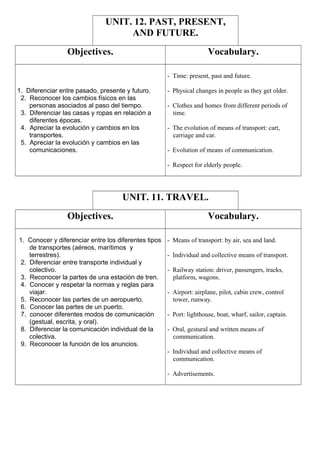 El documento presenta resúmenes de varias unidades de estudio. La Unidad 5 cubre vocabulario y gramática relacionados con el parque. Las Unidades 14 y 15 cubren vocabulario, fonética y gramática sobre verbos y la playa. Las Unidades 9, 11 y 12 cubren objetivos, vocabulario y temas como paisajes, viajes y el pasado, presente y futuro. En total, el documento resume el contenido de varias lecciones de una clase de idiomas.