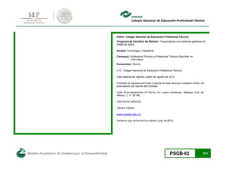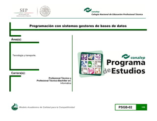 Este documento presenta el programa de estudios para el módulo de "Programación con sistemas gestores de bases de datos" para las carreras de Profesional Técnico y Profesional Técnico-Bachiller en Informática. Incluye el objetivo general de las carreras, las competencias transversales, y detalles sobre el propósito, unidades y contenido del módulo.