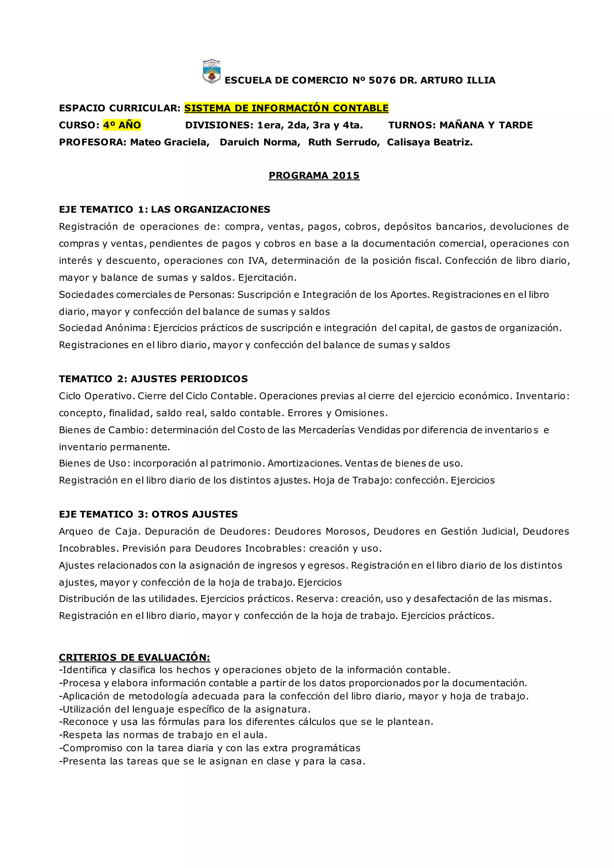 Este documento presenta el programa de estudios de Contabilidad para el año 2015 en la Escuela de Comercio No 5076 Dr. Arturo Illia. El programa consta de tres ejes temáticos: 1) Las organizaciones, incluyendo registros contables básicos y diferentes tipos de sociedades; 2) Ajustes periódicos como inventarios y amortizaciones; y 3) Otros ajustes como arqueo de caja y distribución de utilidades. Los estudiantes serán evaluados en base a su capacidad de procesar y presentar información contable sigui