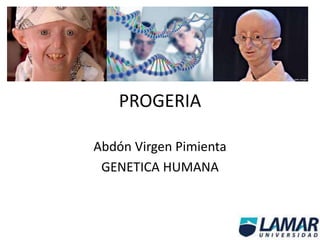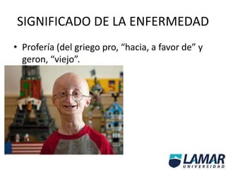 La progeria es un raro trastorno genético caracterizado por un envejecimiento prematuro, con síntomas como baja estatura, pérdida de cabello y articulaciones rígidas. Suele causar la muerte prematura por enfermedades cardiovasculares entre los 7 y 27 años. Aunque los casos son mayormente esporádicos, se cree que sigue un patrón de herencia autosómico dominante. No existe tratamiento que revierta el envejecimiento acelerado, solo para tratar los síntomas.