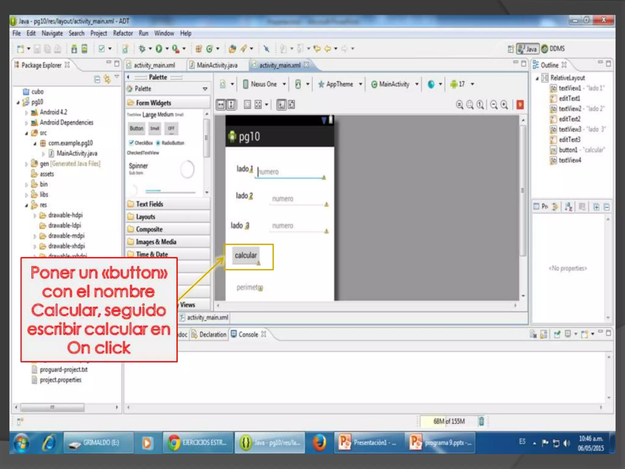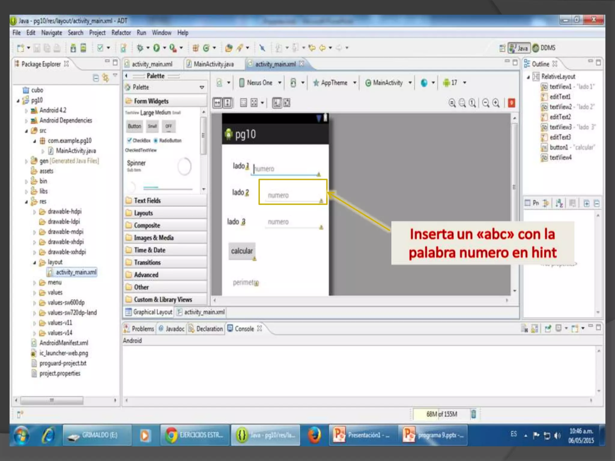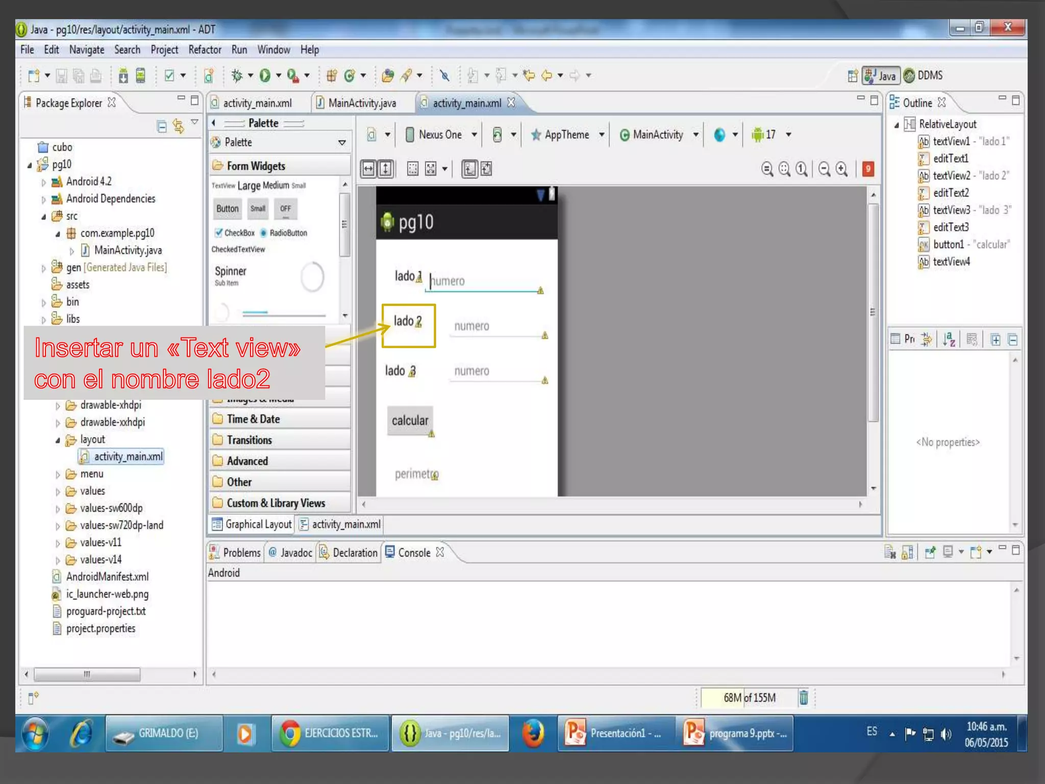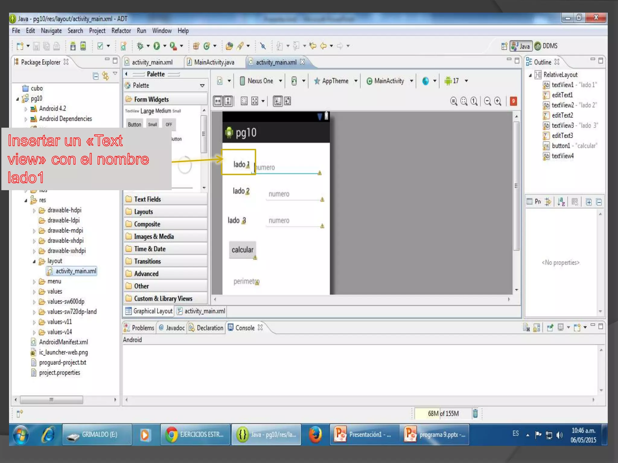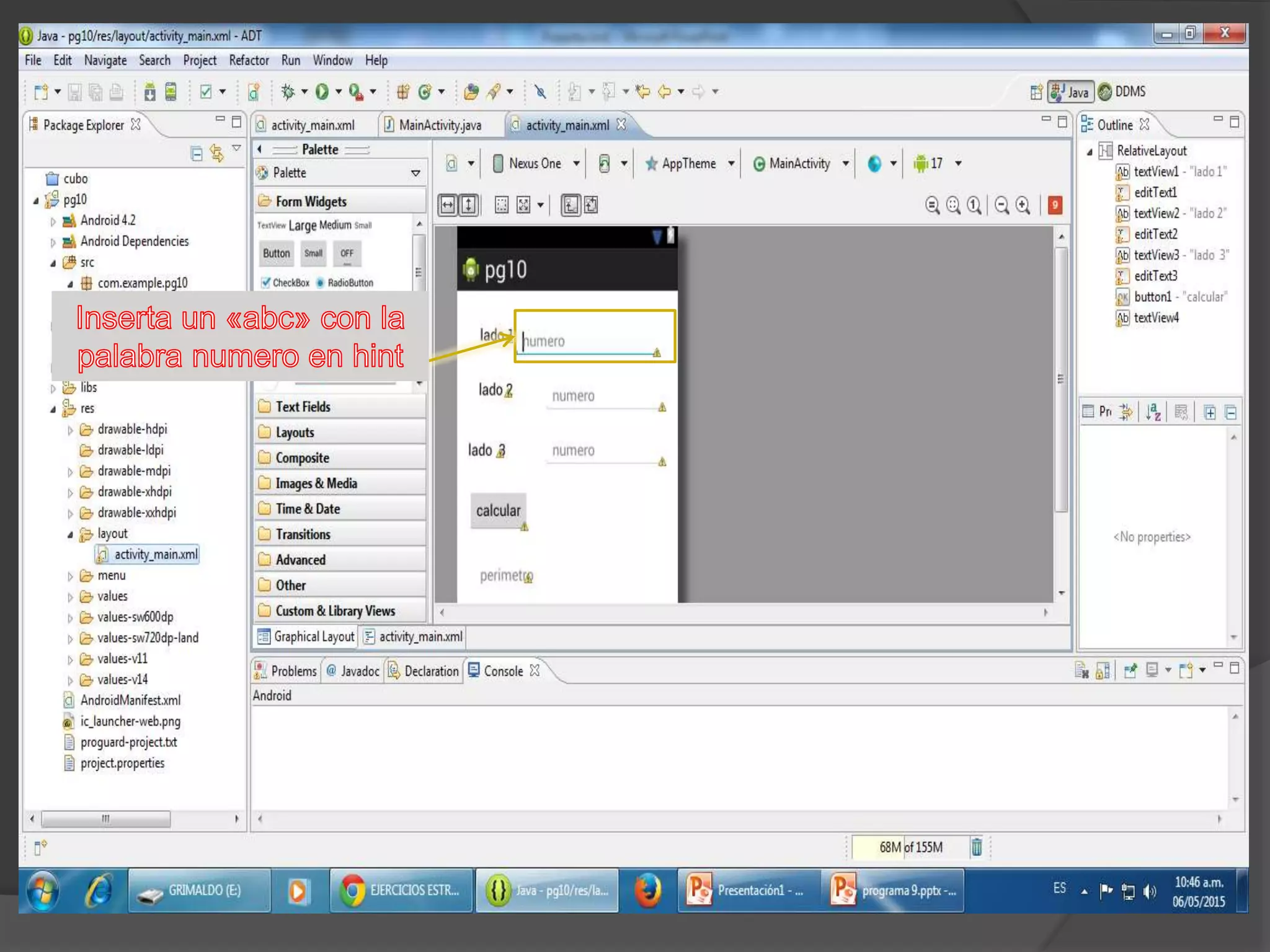 El documento habla sobre insertar un texto con el nombre "perímetro" y luego agregar código para que el programa funcione y corra.