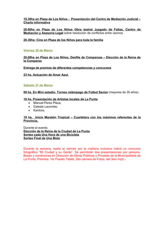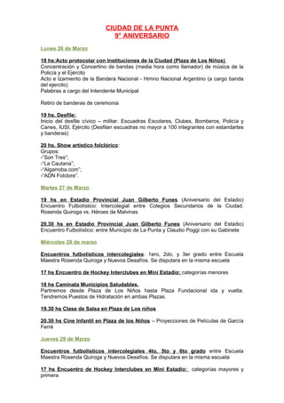 El documento presenta el programa de actividades para celebrar el 9o aniversario de la Ciudad de La Punta durante la semana del 26 al 31 de marzo, incluyendo actos protocolares, desfiles cívicos y escolares, shows artísticos folclóricos, encuentros deportivos de fútbol y hockey entre colegios e instituciones, caminatas, clases de salsa, cine infantil, obras teatrales, desfiles de comparsas, conciertos y una maratón tropical para finalizar los festejos.