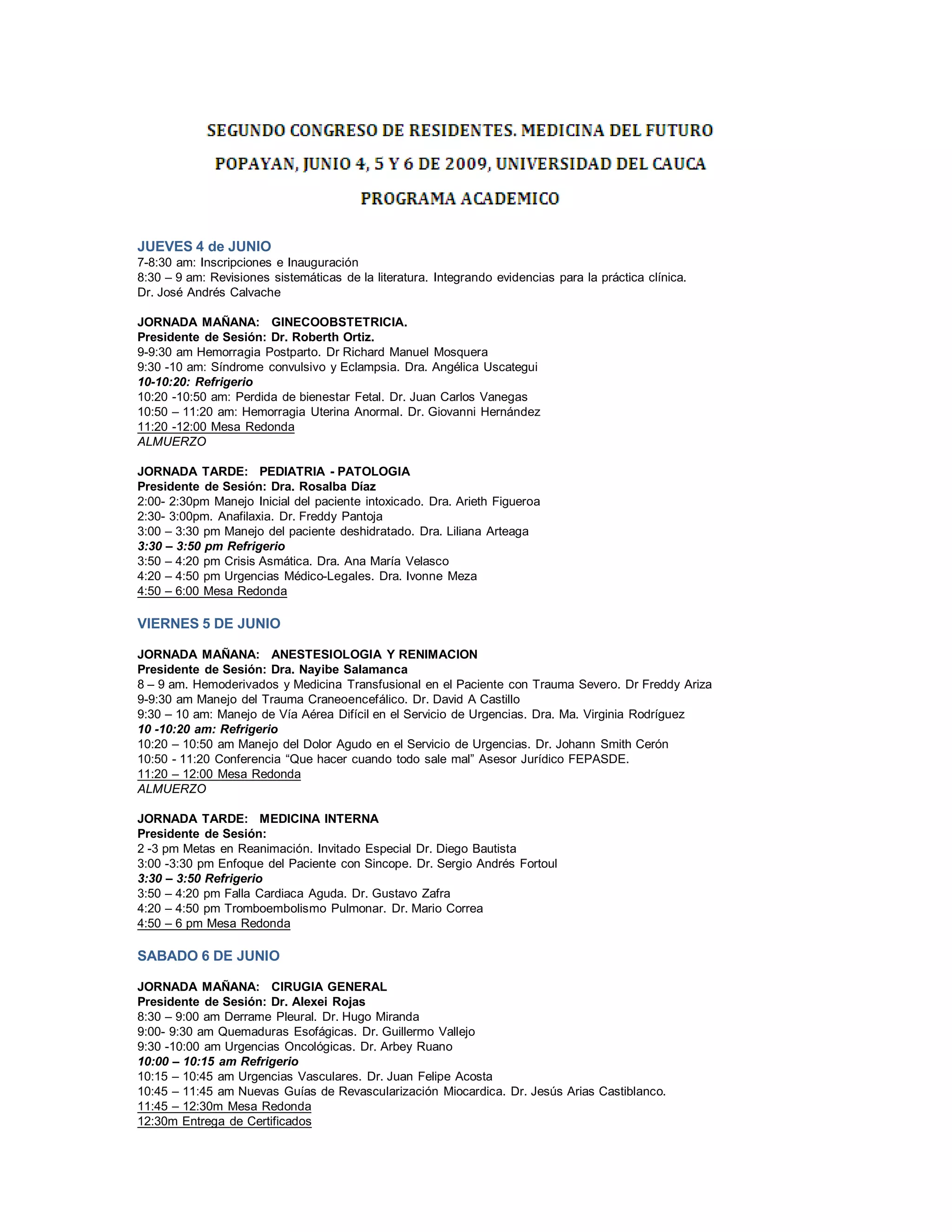 Este documento presenta el programa de una conferencia médica de varios días que abarca temas de ginecología, obstetricia, pediatría, patología, anestesiología, reanimación, medicina interna y cirugía general. El programa incluye ponentes, temas y horarios para cada sesión de la conferencia los días jueves, viernes y sábado.