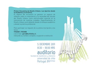 El documento resume el programa del Primer Encuentro de Diseño Urbano organizado por el Departamento de Urbanismo de la Facultad de Arquitectura y Urbanismo de la Universidad de Chile. El evento se llevará a cabo el 5 de diciembre de 2011 y contará con paneles de discusión sobre el aporte del diseño urbano desde la academia y la práctica profesional. El objetivo del encuentro es generar un espacio de reflexión sobre la importancia del diseño urbano para la planificación de ciudades.