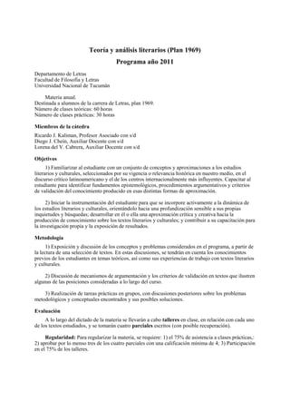 Este documento presenta el programa de la materia Teoría y Análisis Literarios dictada en el Departamento de Letras de la Universidad Nacional de Tucumán. La materia es anual y está destinada a estudiantes de la carrera de Letras. El programa incluye 60 horas de clases teóricas y 30 horas de clases prácticas. Los objetivos son familiarizar a los estudiantes con enfoques de los estudios literarios y capacitarlos para la investigación y exposición de resultados. La metodología consiste en exposición y discusión de conceptos,