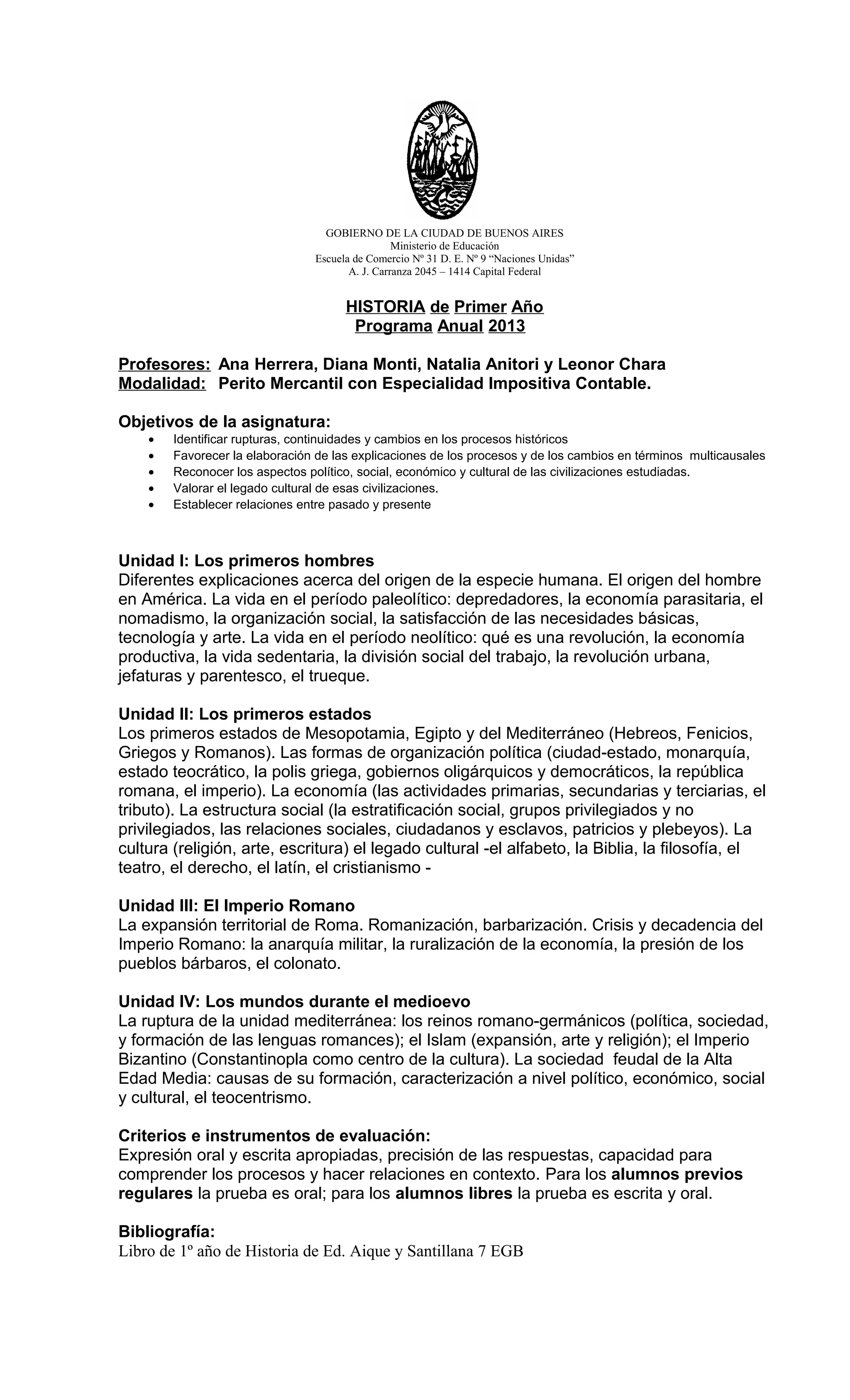 Este documento presenta el programa anual de Historia de Primer Año de la Escuela de Comercio No 31 en Buenos Aires. Cubre cuatro unidades: 1) Los primeros hombres, desde los orígenes de la humanidad hasta la revolución neolítica; 2) Los primeros estados de Mesopotamia, Egipto, los hebreos, fenicios, griegos y romanos; 3) El Imperio Romano y su expansión y decadencia; y 4) Los mundos medievales en Europa, el Islam y Bizancio. Evalúa a los estudiantes basado en