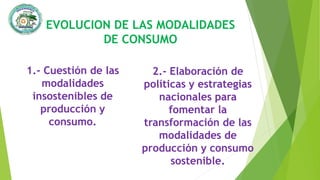 Este documento describe la evolución de las modalidades de consumo y la necesidad de adoptar modalidades más sostenibles. Se propone elaborar políticas y estrategias nacionales para fomentar la transformación hacia modalidades de producción y consumo sostenibles a través de mayor eficiencia en recursos, reducción de desechos, y asistencia para decisiones de compra ecológicas.