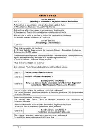 Este documento presenta el programa preliminar del XIV Seminario Latinoamericano y V Congreso Nacional de Ciencia y Tecnología de Alimentos que se llevará a cabo del 31 de marzo al 2 de abril de 2014 en Costa Rica. El programa incluye cursos pre y post-congreso, sesiones plenarias, charlas magistrales y sesiones técnicas sobre temas como tecnologías innovadoras de procesamiento de alimentos, biotecnología, fermentación, desarrollo de alimentos funcionales, inocuidad alimentaria y