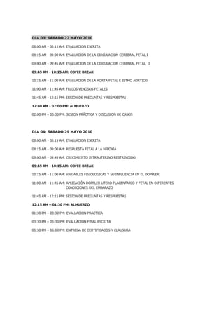 El documento presenta el programa de un curso teórico práctico de ultrasonografía Doppler en obstetricia dividido en 4 días. Cada día se cubrirán diferentes temas relacionados con la física del ultrasonido Doppler, la evaluación de vasos sanguíneos maternos y fetales, y su aplicación en diferentes condiciones del embarazo. Incluirá sesiones teóricas, prácticas, discusiones de casos y evaluaciones escritas.