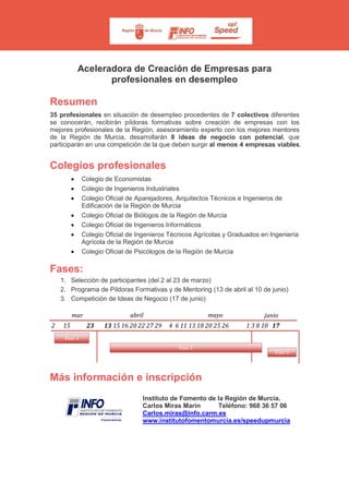 El programa Aceleradora de Creación de Empresas ofrece formación y asesoramiento a 35 profesionales en desempleo de diferentes sectores en la región de Murcia, con el objetivo de desarrollar al menos 4 empresas viables a partir de 8 ideas de negocio. Durante el proceso, los participantes recibirán capacitaciones sobre creación de empresas, trabajo en equipo, investigación de mercados y comunicación efectiva, entre otros temas. El programa culminará con una competición de ideas de negocio el 17 de junio.