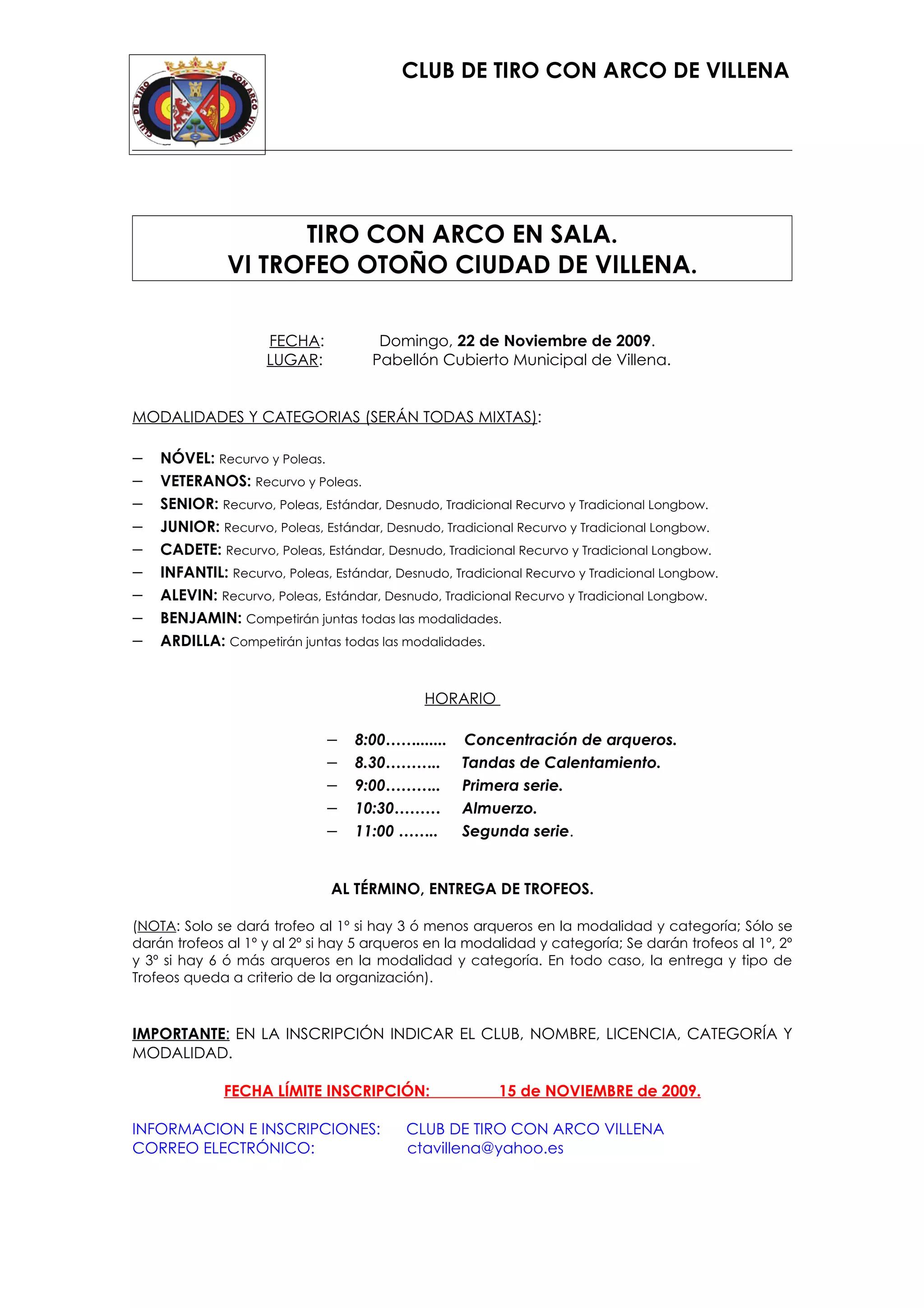 El Club de Tiro con Arco de Villena organiza el VI Trofeo Otoño Ciudad de Villena de tiro con arco en sala el 22 de noviembre de 2009 en el Pabellón Cubierto Municipal de Villena. La competición incluirá varias categorías y modalidades mixtas para niños y adultos. Los participantes deberán inscribirse antes del 15 de noviembre indicando su club, nombre, licencia, categoría y modalidad.